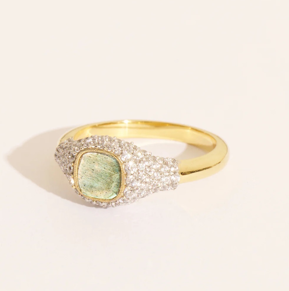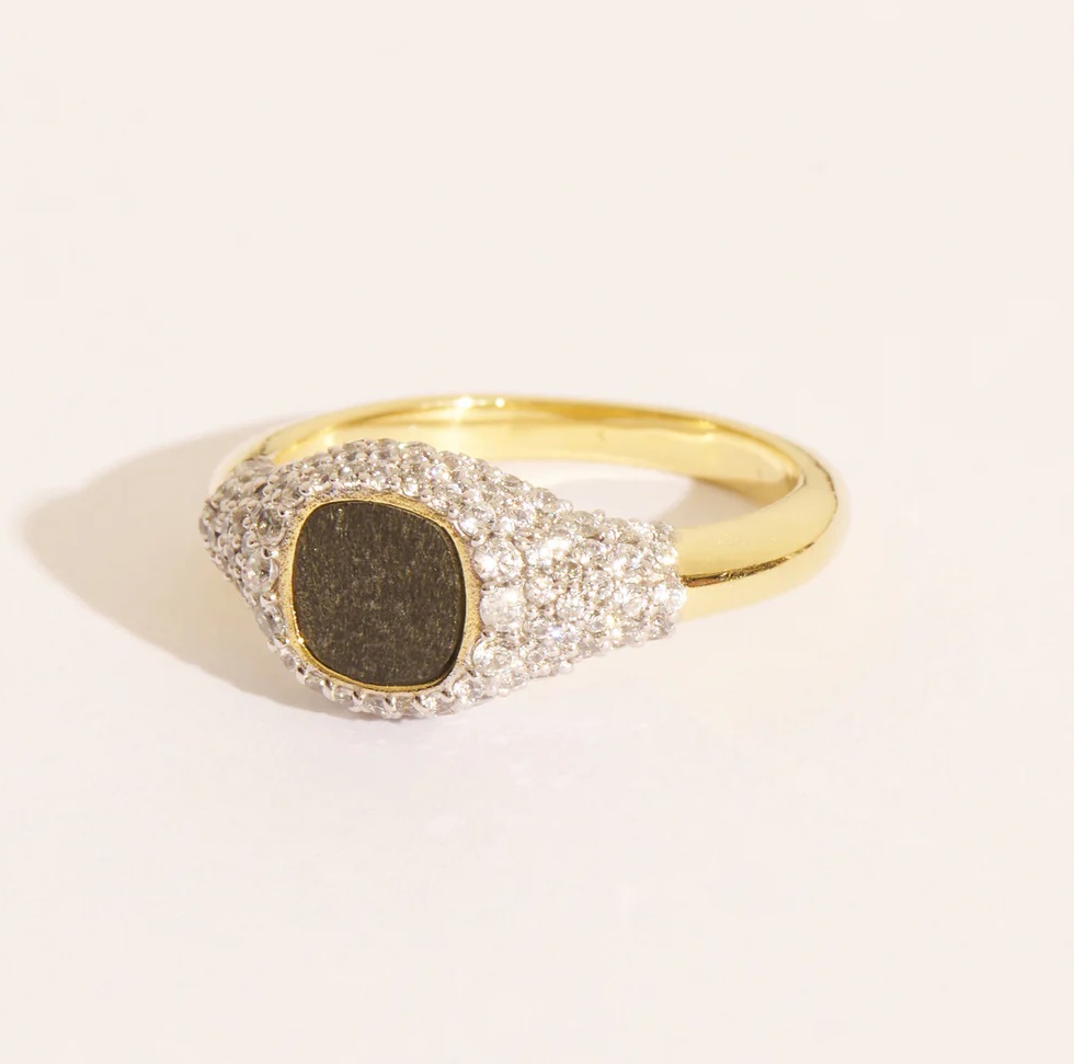 Holy c’est une fine chevalière carré alliant traditionnel et modernité, confectionnée à partir d’une base de laiton, elle est dorée à l’or fin 18 K et sertie d’une pierre ( obsidienne ou labradorite) ceint de zircons.