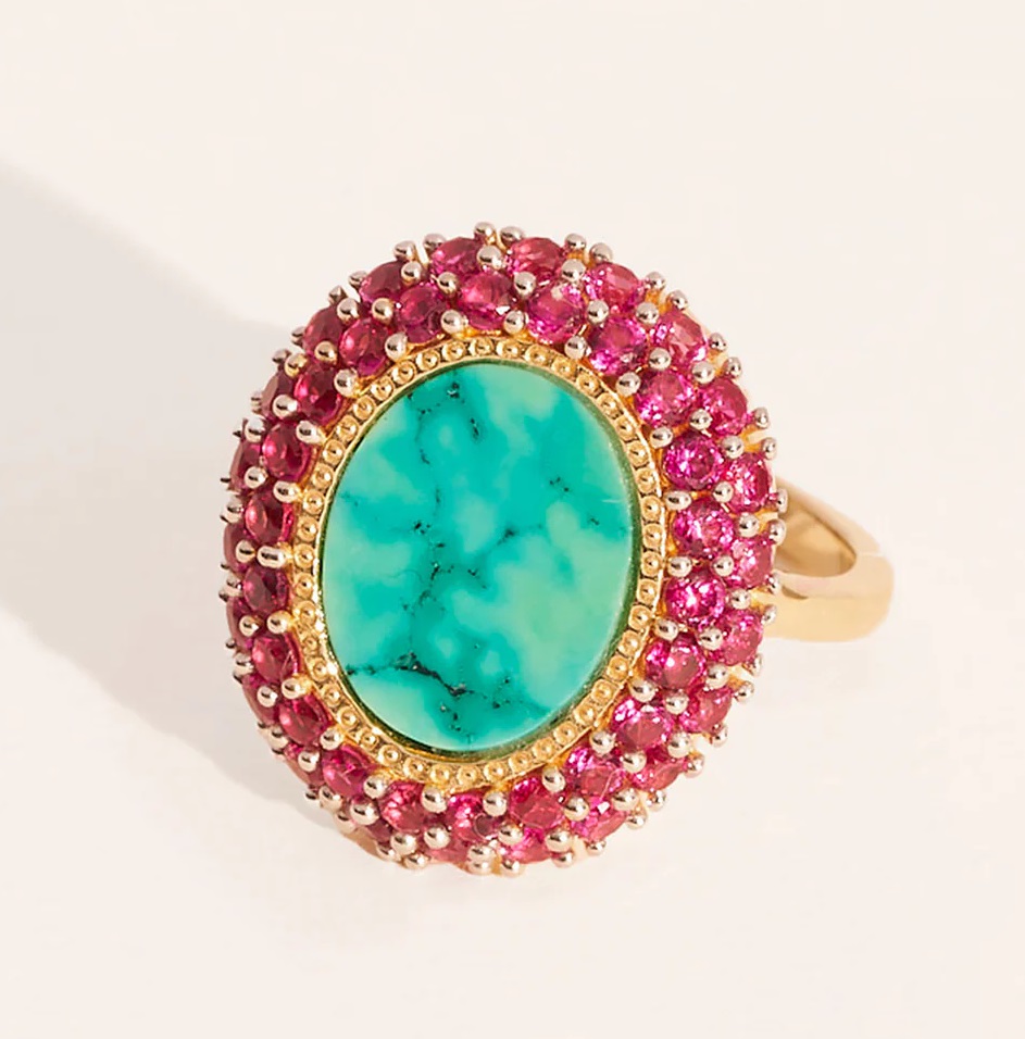 La bague Mirage est confectionnée à partir d’une base de laiton. Elle est dorée à l’or fin 18 K et sertie d’une pierre de turquoise et de zircons.
