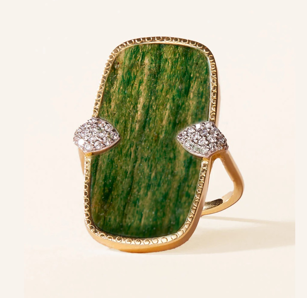 La bague Sangha est confectionnée à partir d’une base de laiton. Elle est dorée à l’or fin 18 K et sertie d’une pierre d’aventurine verte et de zircons.