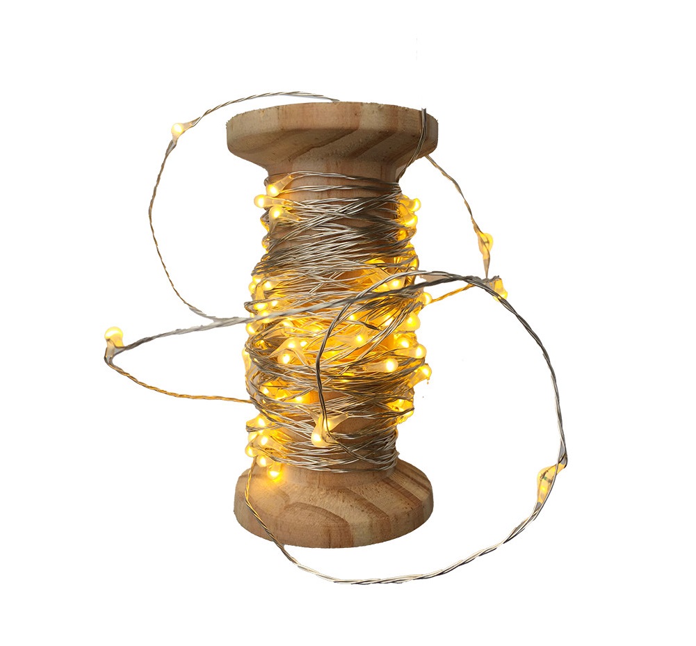 Une guirlande lumineuse enroulée autour d’une bobine de bois. Pratique pour choisir la longueur voulue. Branchement sur secteur