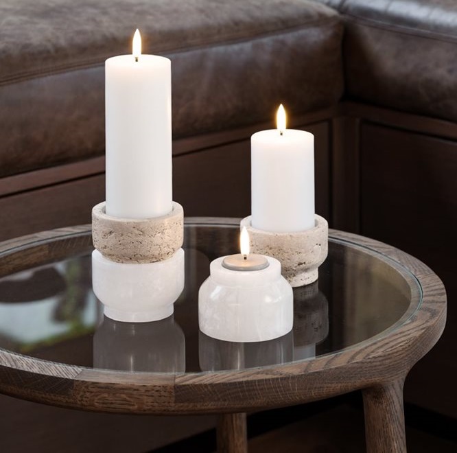 Fabriqué à la main en travertin, ce bougeoir apporte un effet naturel et minéral. Il est utilisable des deux cotés. L’un permet d’y disposer une bougies chauffe-plats, et l’autre des bougies coniques ou piliers.