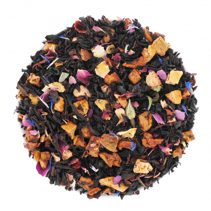 Composition: Thé noir, cubes de pommes, hibiscus, sureau, arômes naturels, églantier, rhubarbe lyophilisés, pétales de bleuet rose, pétales de bleuet bleu, pétales de violette et pétales de rose rouge.