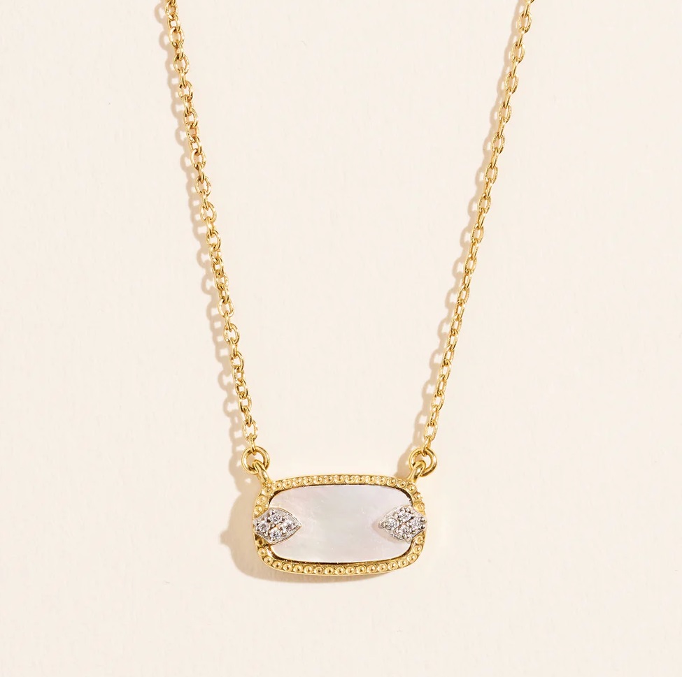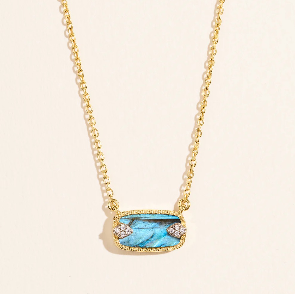 Un collier élégant que vous pourrez porter au quotidien. Le collier Sangha est confectionné à partir d’une base en laiton. Il est dorée à l’or fin 18 K. Le pendentif se constitue d’une pierre de nacre ou de labradorite taillée et serti de zircons.