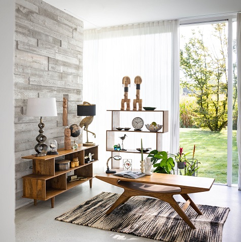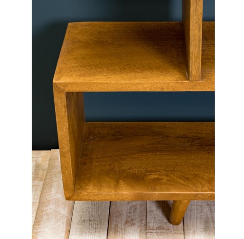 Une étagère lumineuse en bois de manguier couleur miel, aux formes dynamiques. Parfaite pour exposer livres et objets décoratifs !