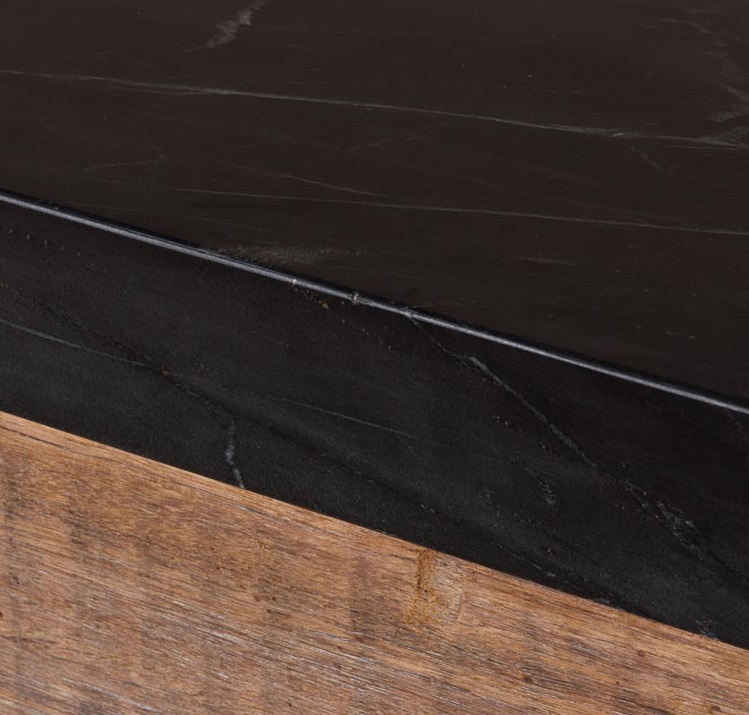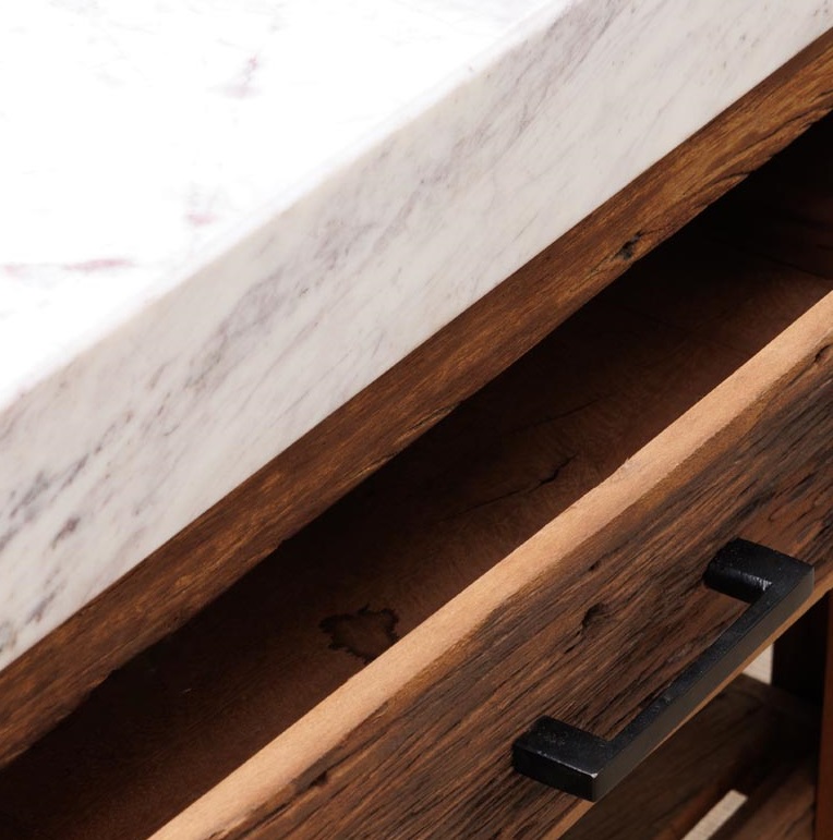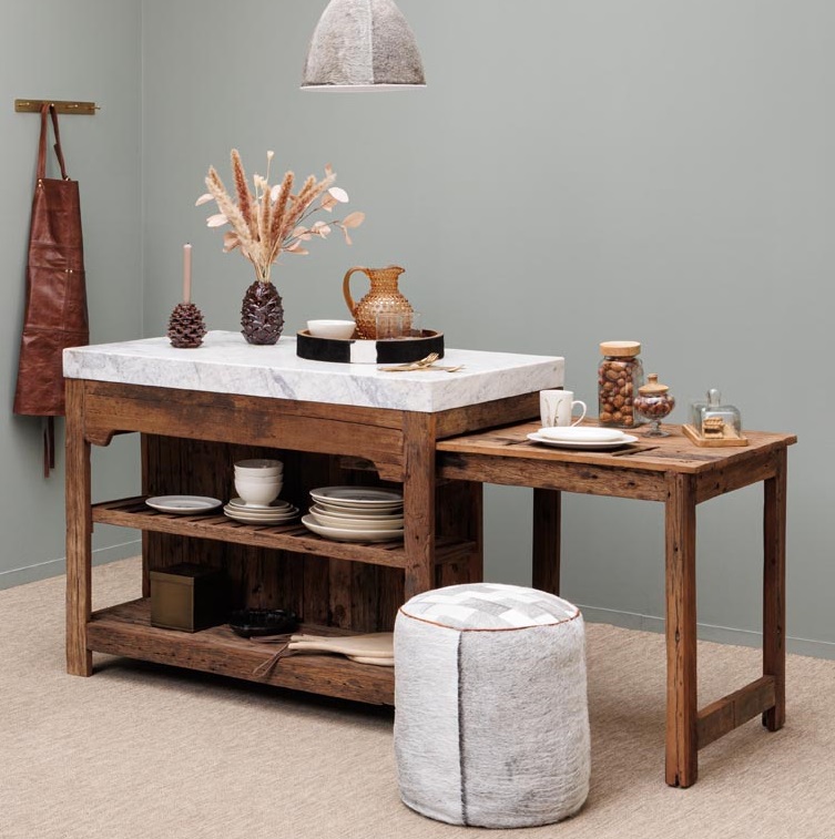 Cet ilot de cuisine allie l’ancien et le moderne, le rustique et l’élégant. Une table coulissante se déplie et se range sous l’ilot suivant les besoins. Le bois est d’apparence brut et vieilli. Un petit tiroir est positionné sur le côté, deux étagères permettent de disposer assiettes où éléments de cuisine.