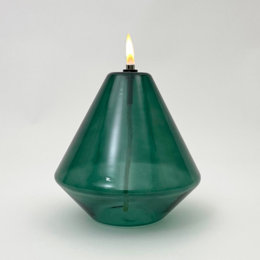 Lampe à huile en verre soufflé, fabriquée à la main. La mèche constituée de fibre de verre est inusable.