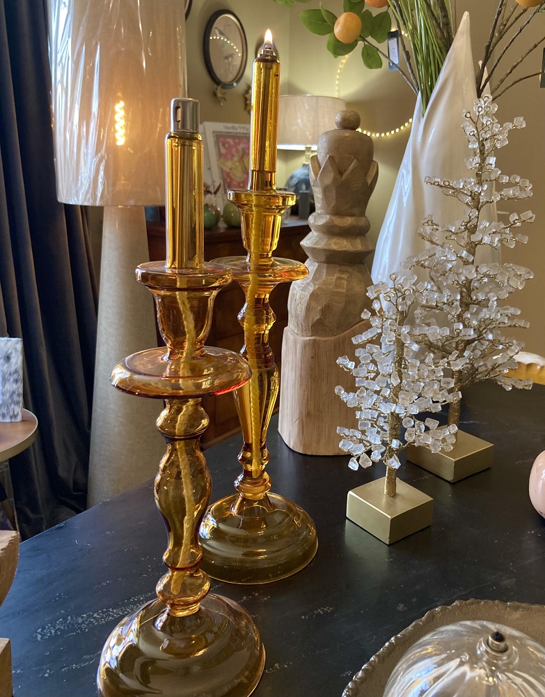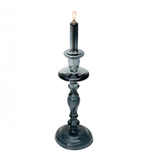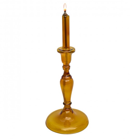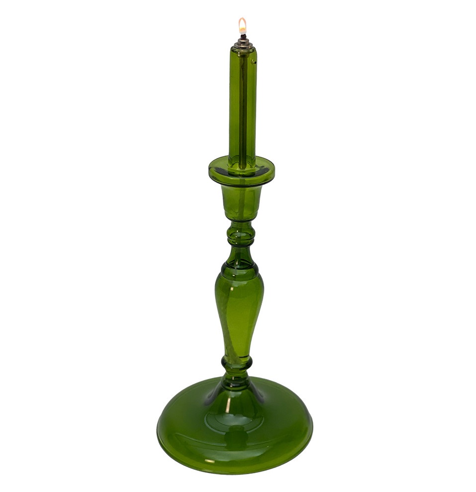 Lampe à huile en verre soufflé en forme de bougeoir. La mèche constituée de fibre de verre est inusable.