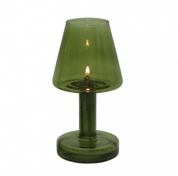Lampe à huile en verre soufflé, fabriqué à la main. La mèche constituée de fibre de verre est inusable.