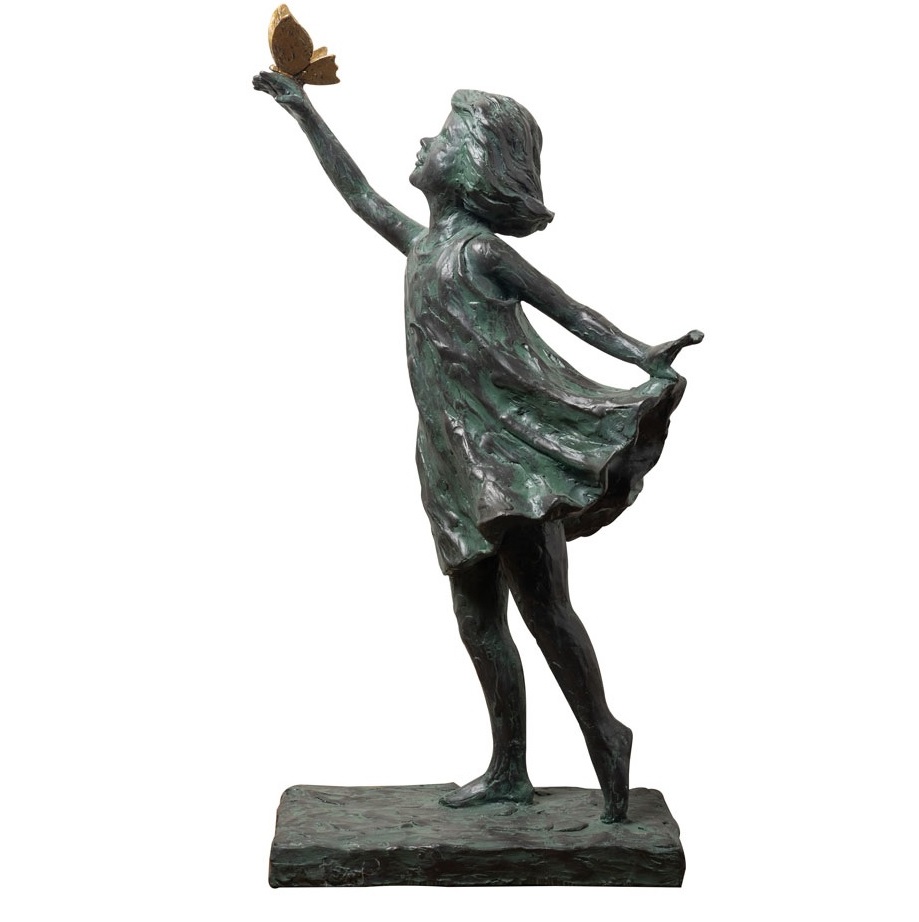 Apporter une touche d’innocence et d’éphémère avec cette statuette représentant une fillette tenant du plat de la main un papillon doré.