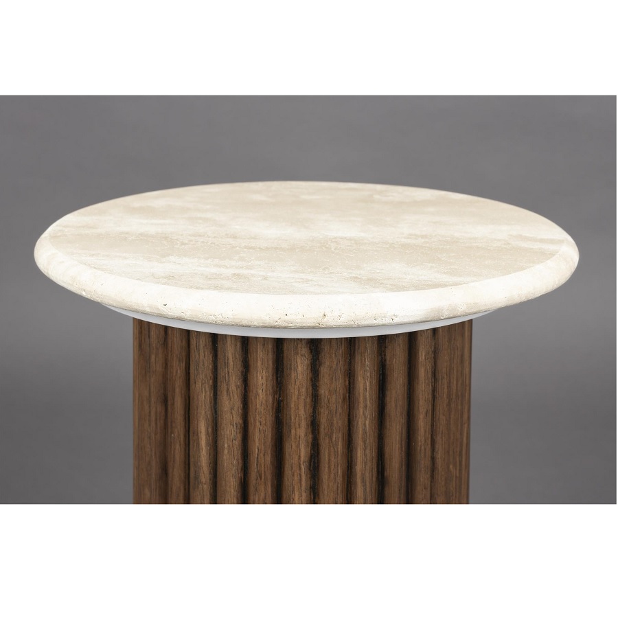 Une belle petite table d’appoint au pied cannelé couleur noyer foncé contrastant avec le plateau clair en travertin.