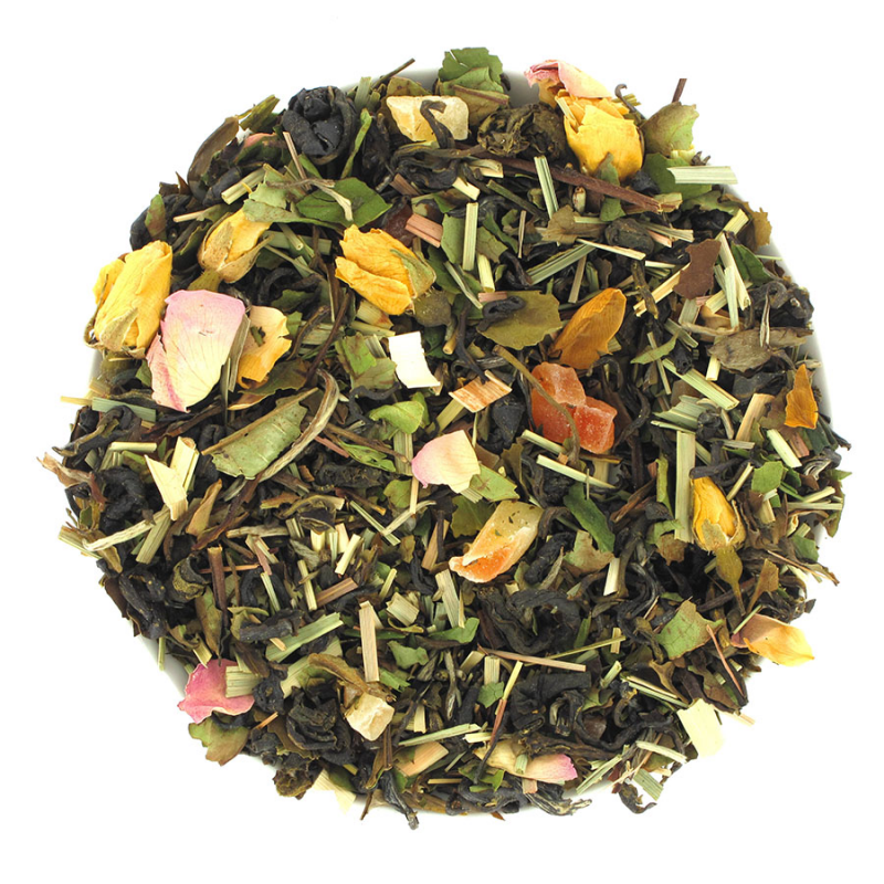 Composition : Thé vert Vietnam, thé blanc paï mu tan, citronnelle, papaye, orange, boutons de rose jaune, arôme de litchi, arôme naturel de passion et de citron vert, pétales de bleuet roses.